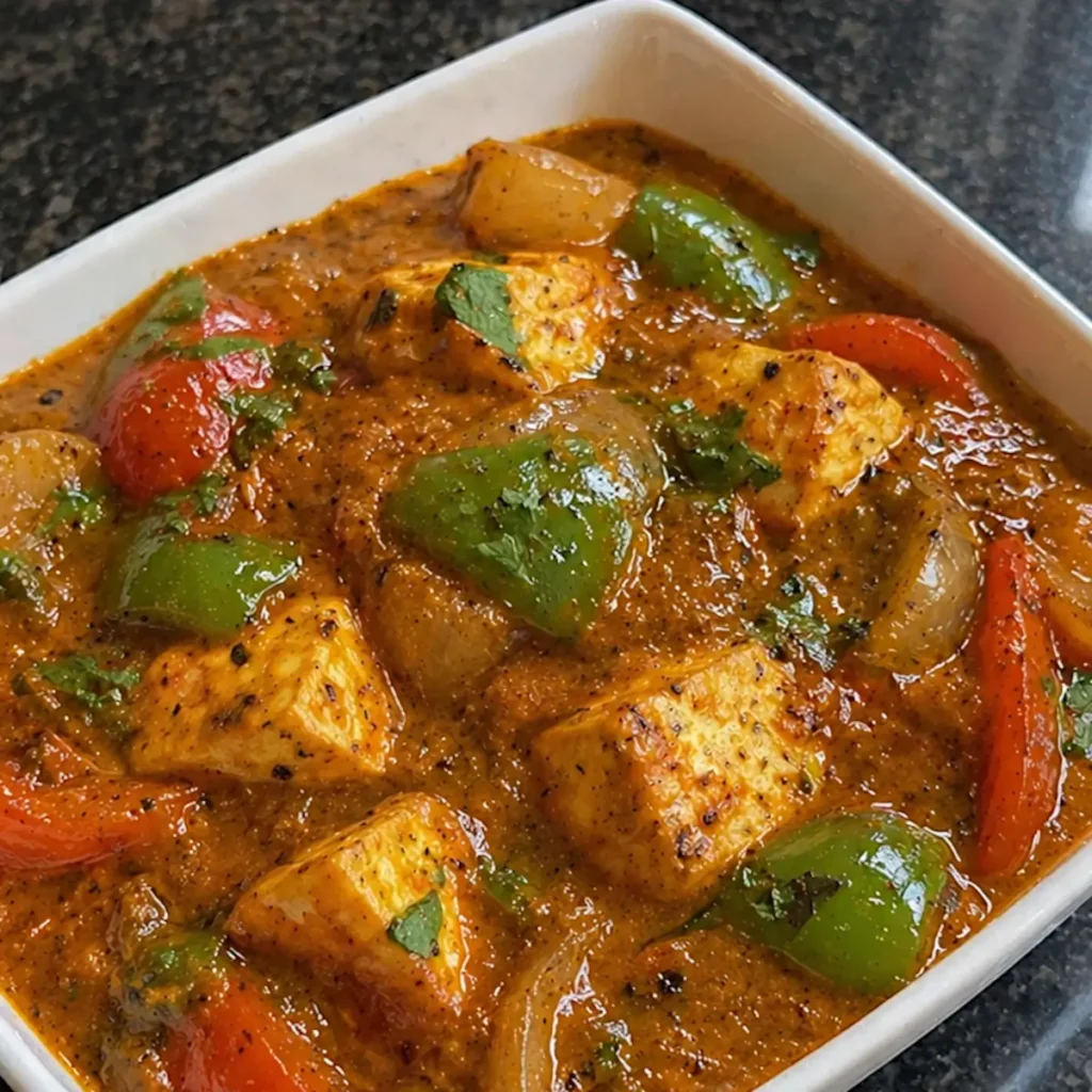 Yes. Use extra-firm tofu, pressed for at least 30 minutes to remove excess moisture, then cut into cubes and seared exactly as you would the paneer. The tofu will not have the same milky richness as paneer but it absorbs the kadai masala beautifully and is an excellent vegan alternative.